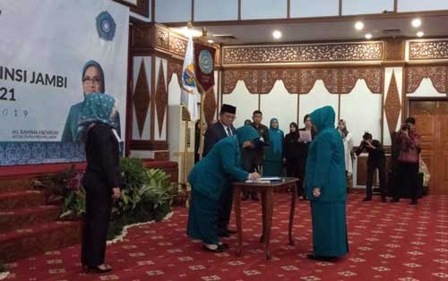 NarasiJurnal.com,Jambi – Ketua Umum Tim Penggerak Pembinaan Kesejahteraan Keluarga (TP-PKK), Erni Guntari Tjahjo Kumolo, Rabu (20/2) pagi, melantik Rahima Fachrori sebagai ketua TP-PKK Provinsi Jambi. Pelantikan berlangsung di auditorium rumah dinas Gubernur Jambi.