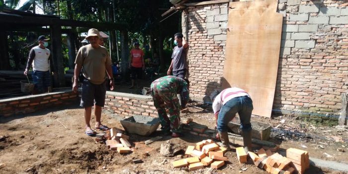 Anggota Satgas Kodim Bute bersama masyarakat mulai memasang bata dinding milik rumah Zakri (57) warga Desa Air Gemuruh, Kecamatan Bathin III Kabupaten Bungo. Jumat (27/03/2020)
