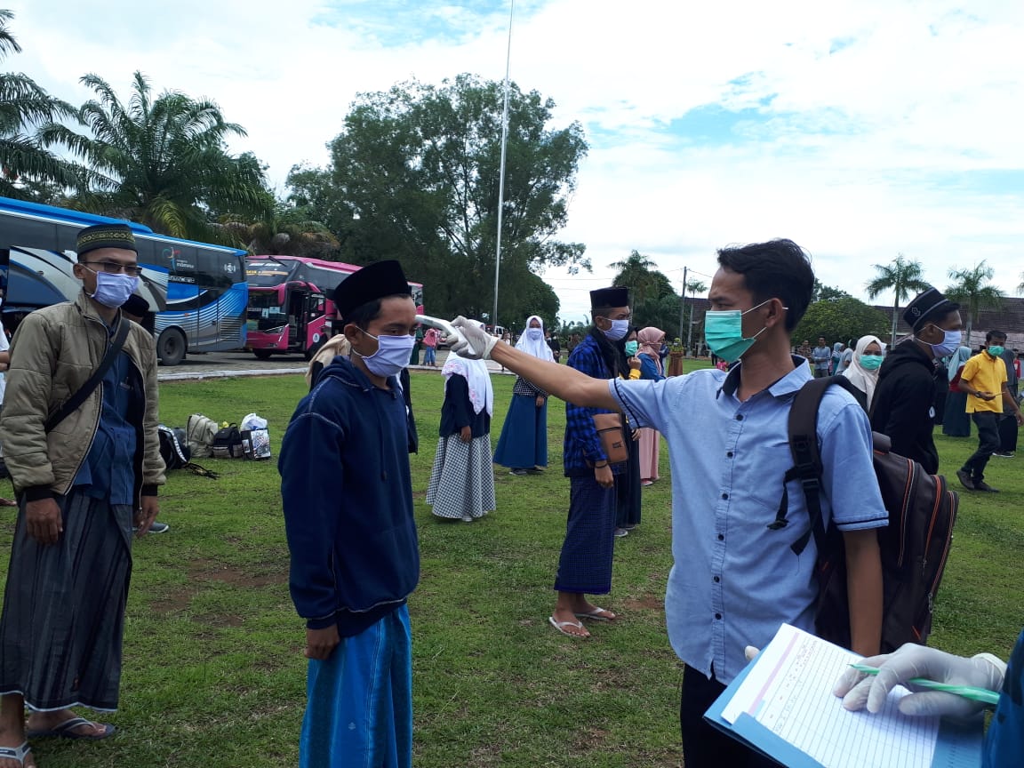 Satgas Covid-19 Kabupaten Bungo memeriksa dan mendata santri dan santriwati yang pulang dari Jawa. Pengecekan suhu dilakukan di lapangan upacara Kantor Bupati Bungo sekitar pukul 11:50 Jumat (3/04/2020).
