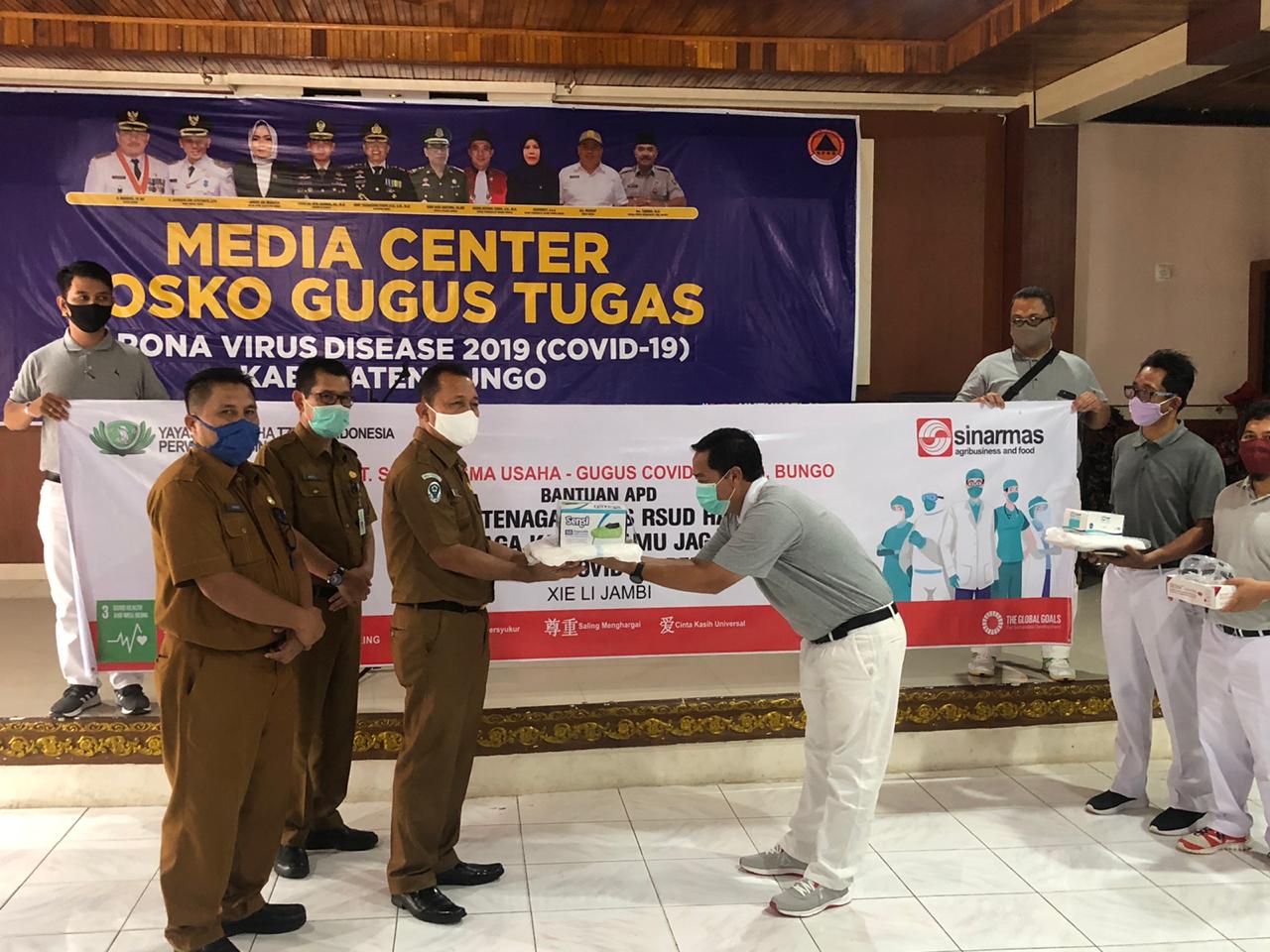 Tim Gugus Tugas penanganan covid-19 Kadinkes Bungo dokter Safarudin Matondang menyampaikan, ucapan terima kasih kepada pihak PT.SKU, Sinarmas yang telah memberikan bantuan kepada tenaga medis. Bantuan APD berupa baju hazmat 100 Psc, Kacamata Google 50 Psc. Sepatu untuk melengkapi baju hazmat dan masker bedah.