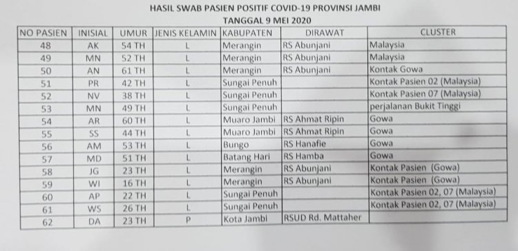 NARASIJURNAL.COM, Jambi,– Dari 47 menjadi 62 kasus terkonfirmasi positif covid-19 di Provinsi Jambi hingga Sabtu (9/05/2020).Satu Pasien baru tambahan dari Kabupaten Bungo.