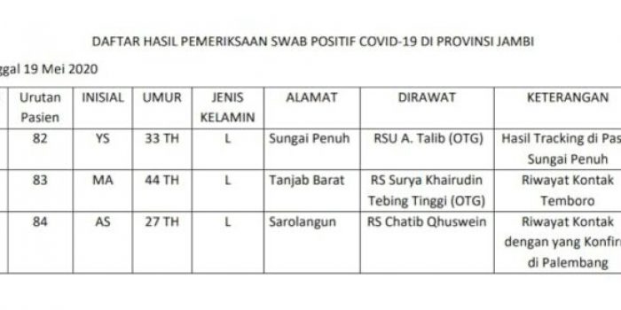 Juru bicara penanganan covid-19 Provinsi Jambi Johansyah menuturkan, adapun 3 tambahan pasien terkonfirmasi covid-19 baru hari ini, berasal dari tiga daerah yakni, pasien dari Daerah Sungai Penuh, Kabupaten Tanjab Barat dan Kabupaten Sarolangun.