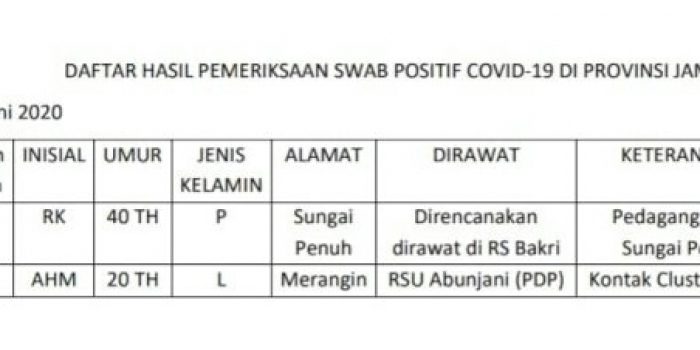 NARASIJURNAL.COM, Bungo,- Update perkembangan covid-19 di Provinsi Jambi Jum’at (5/06/2020) kali ini bertambah lagi pasien baru 2 orang terkonfirmasi positif covid-19.