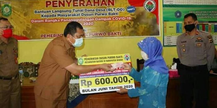 NARASIJURNAL.COM, Bungo,- Penyerahan Bantuan Langsung Tunai (BLT) Dana Desa tahap II di Dusun Purwo Bakti Kecamatan Bathin III, secara simbolis diserahkan oleh Bupati Bungo H.Mashuri, Senin (15/06/2020).