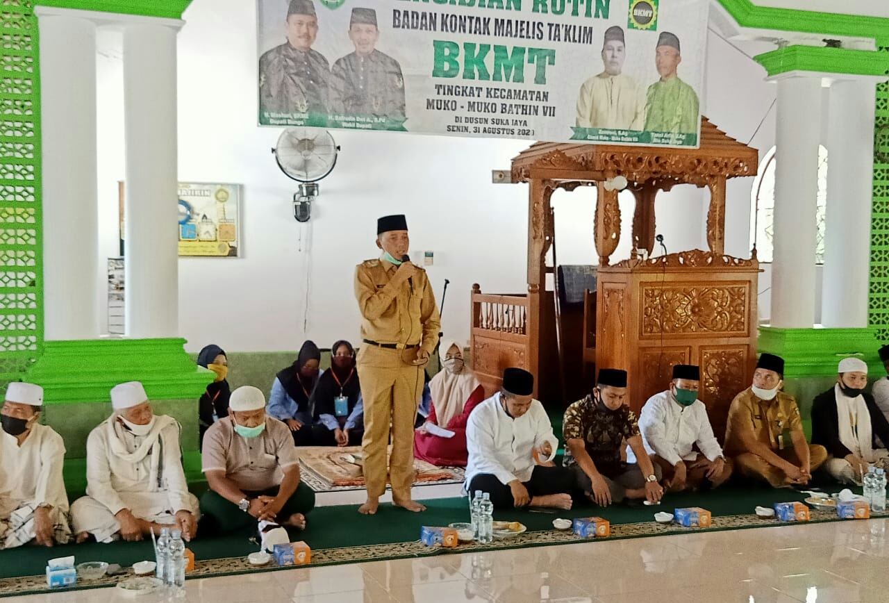NARASIJURNAL.COM, Bungo,- Kegiatan pengajian sangat penting dihidupkan disetiap Dusun, karena ini kebutuhan rohani manusia, guna membersihkan jiwa dengan meningkatkan ilmu pengetahuan keagamaan kepada masyarakat melalui pengajian Badan Kontak Majelis Ta’lim (BKMT). Hal ini disampaikan Wakil Bupati Bungo H.Safrudin Dwi Aprianto S.Pd saat menghadiri pengajian rutin BKMT Kecamatan Muko-muko Bathin VII di Masjid Muhajirin Dusun Suka Jaya, Senin (31/08/2020).