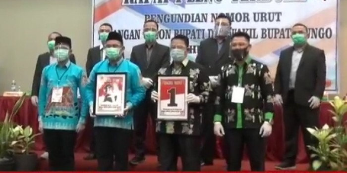 Suasana pengundian nomor urut berlangsung, tetap memperhatikan kedisiplinan penerapan protokol kesehatan covid-19. Paslon dan rombongan dibatasi untuk memasuki ruang utama, KPUD Bungo juga menyediakan layar di luar ruang utama untuk disaksikan para rombongan kedua Paslon, serta menyiarkan secara langsung melalui akun Facebook, bisa disaksikan seluruh masyarakat Kabupaten Bungo.