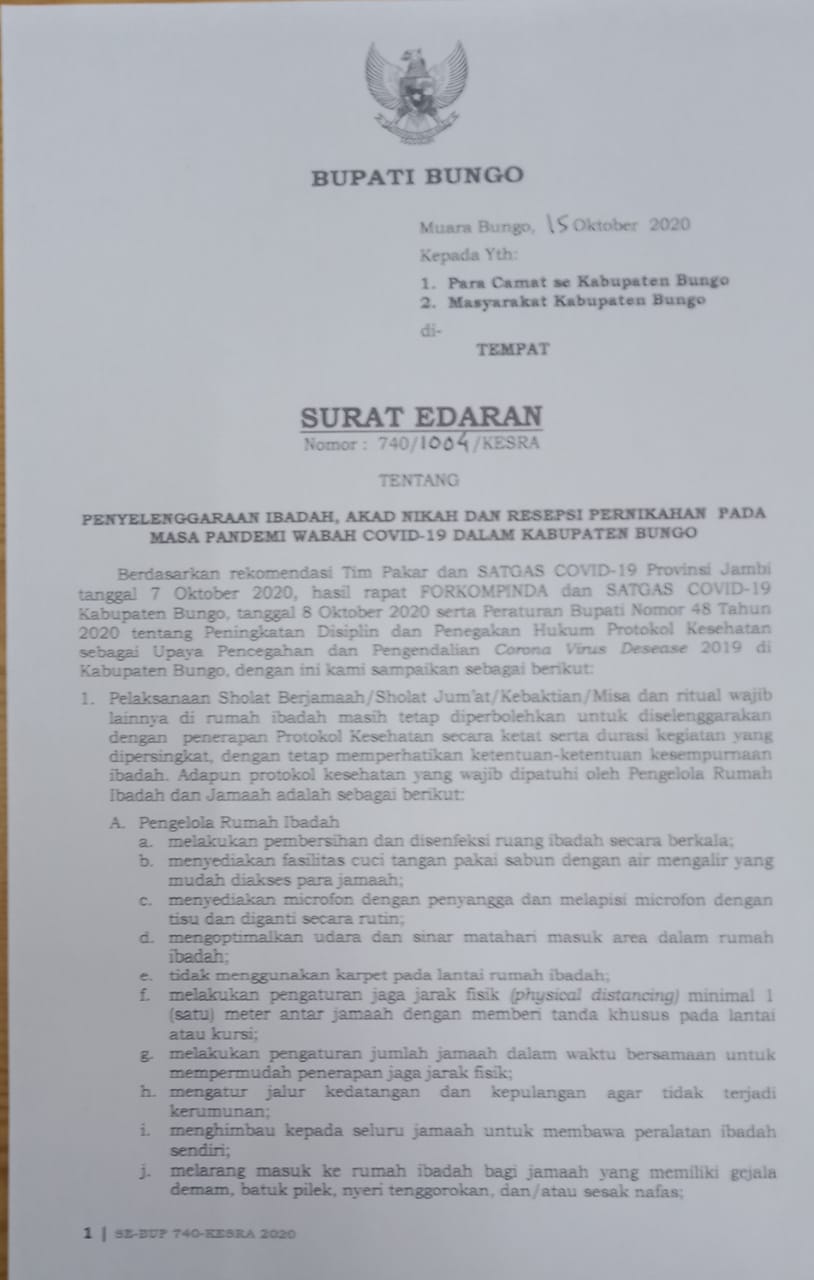 Ini Surat Edaran Bupati Bungo Terbaru, Tentang Penyelenggara Ibadah,Akad Nikah dan Resepsi Pernikahan pada Masa Pandemi Covid-19
