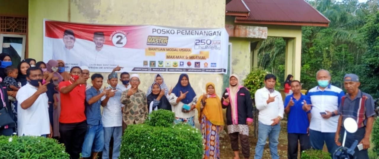 NARASIJURNAL.COM, BUNGO – Warga Dusun Sarana Jaya, Kecamatan Bathin III, antusias menyambut kehadiran tim pemenangan pasangan calon Hamas-Apri. Kehadiran Tim Hamas-Apri sudah ditunggu-tunggu oleh warga Dusun Sarana Jaya.