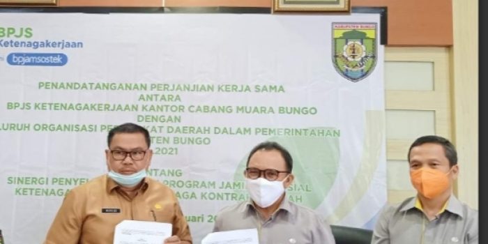 NARASIJURNAL.COM, BUNGO- Pemerintah Kabupaten Bungo teken MoU dengan pihak BPJS Ketenagakerjaan Muara Bungo, dilakukan oleh Sekda Bungo H Mursidi di ruang pola utama Kantor Bupati Bungo, Selasa (19/01/2021).