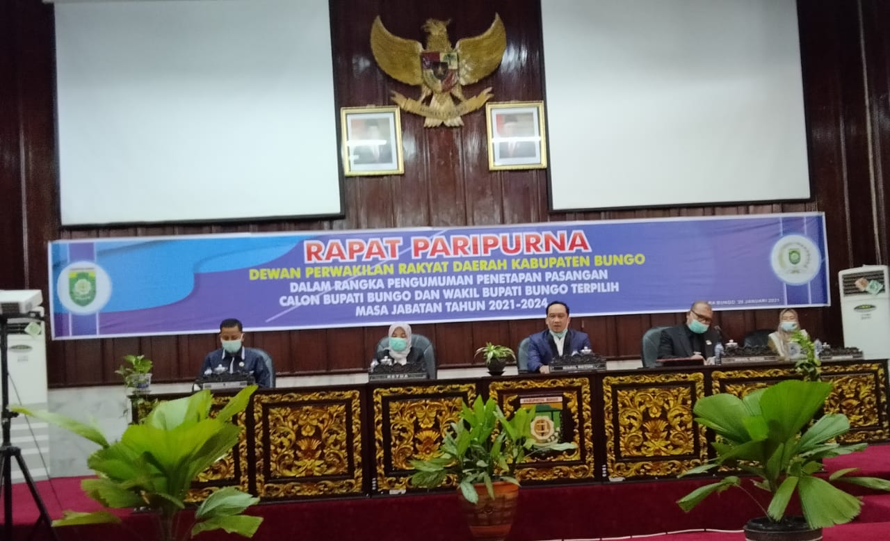 NARASIJURNAL.COM, BUNGO- Sidang Rapat Paripurna DPRD Kabupaten Bungo dalam rangka pengumuman penetapan hasil pasangan Calon Bupati dan Wakil Bupati terpilih pada Pilkada tahun 2020, paripurna berlangsung khidmat di ruang Aula rapat DPRD Bungo, Selasa, (26/01/2021).