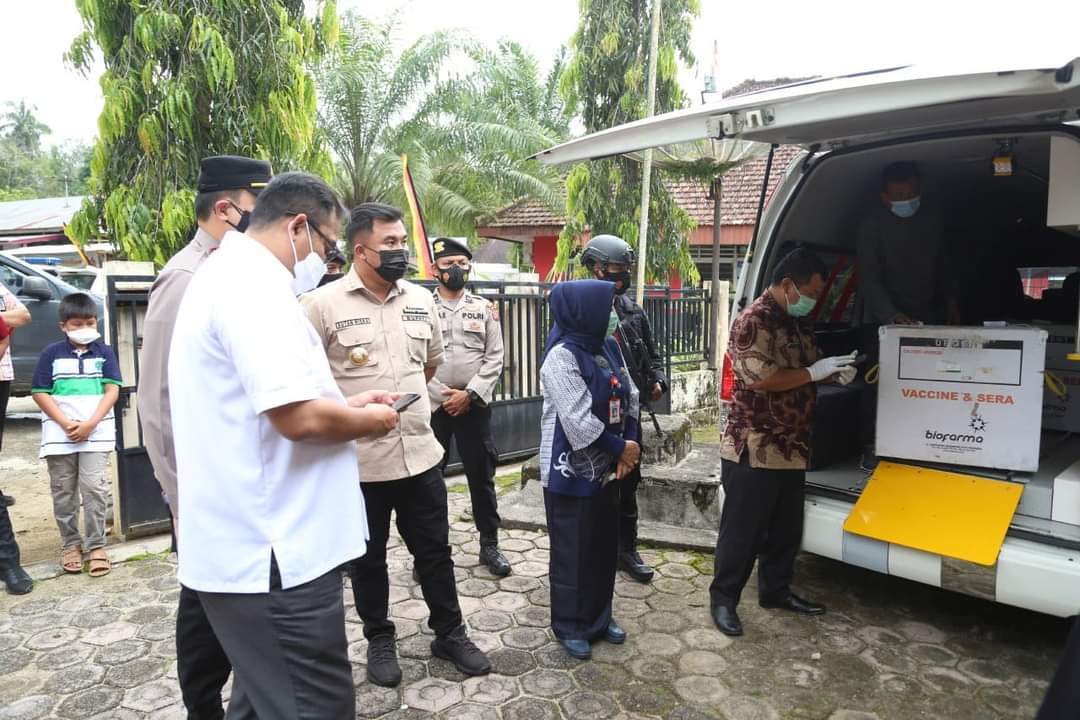 Bupati Dharmasraya, Sutan Riska Tuanku Kerajaan, Kajari Darmasraya dan Kapolres Dharmasraya turut menyambut kedatangan 3.000 Vaksin Sinovac di gudang penyimpanan farmasi Dharmasraya dan menyaksikan langsung proses penyimpanan vaksin sesuai SOP yang ada.(mde)