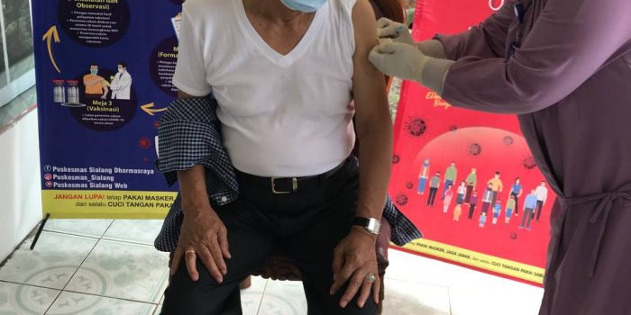 NARASIJURNAL. COM-DHARMASRAYA – Wakil Bupati Dharmasraya, DP Datuk Labuan beserta istri, Ny Mega Dasril, mendapat vaksin Covid-19 dosis pertama, Selasa (6/4/21). Vaksinasi dilakukan oleh tim vaksinator dari Dinas Kesehatan dan Puskesmas Sialang, di kediaman beliau di Nagari Sungai Kambut, Pulau Punjung.