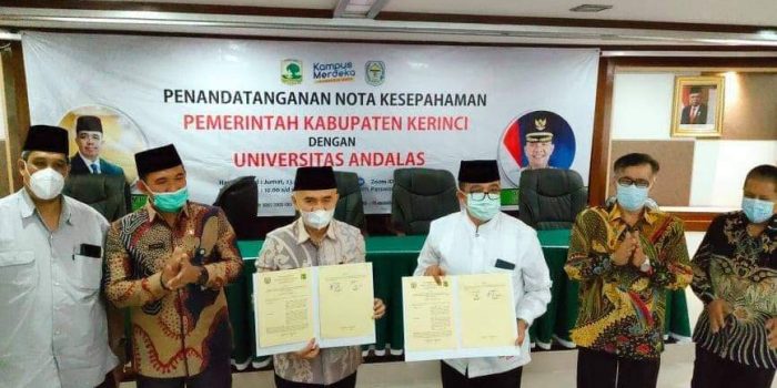 “Alhamdulillah Penandatanganan Nota Kesepahaman Pemerintah Kabupaten Kerinci dengan Universitas Andalas hari ini berjalan lancar dan sukses. Semoga sinergitas ini dapat terjalin dengan baik dalam rangka saling mendukung program satu sama lain, ” kata Bupati.