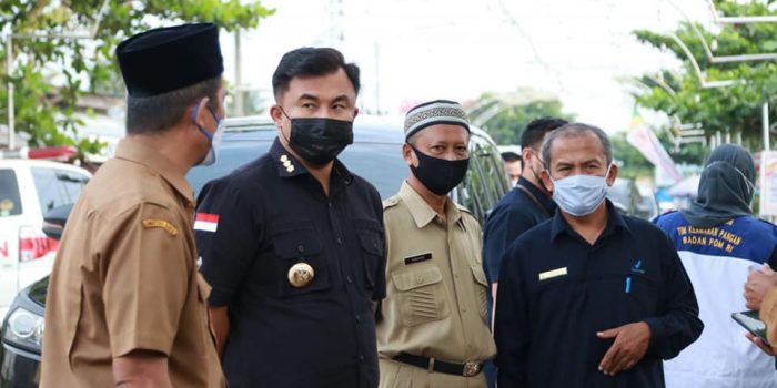 DHARMASRAYA – Bupati Dharmasraya, Sutan Riska Tuanku Kerajaan, berkunjung ke Pasar Pabukoan Nagari Sungai Duo, Senin (26/4/21). Bupati tidak datang sendirian, melainkan bersama Tim Keamanan Pangan Badan POM, dan turut didampingi Asisten II beserta pejabat dinas terkait, diantaranya Dinas Kesehatan, Dinas Satpol PP dan Damkar, Dinas Kumperdag, Bagian Perekonomian dan SDA, Pemerintah Kecamatan Sitiung dan Pemerintah Nagari Sungai Duo.
