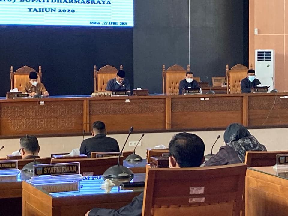 DHARMASRAYA – DPRD Kabupaten Dharmasraya menyerahkan sejumlah rekomendasi terkait Laporan Keterangan Pertanggungjawaban (LKPj) Tahun Anggaran 2020 pada Rapat Paripurna di Ruang Rapat Utama Gedung DPRD Kabupaten Dharmasraya, Selasa (27/4/21).