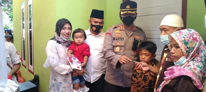 Penyerahan kunci rumah secara simbolis degan ditandai pemotongan pita oleh Kapolres Bungo AKBP M.Lutfi S.I.K, didampingi Brigpol Maidani beserta istri, Kapolsek, Camat, Rio dan disaksikan tamu undangan yang hadir. Jum’at (18/06/2021).