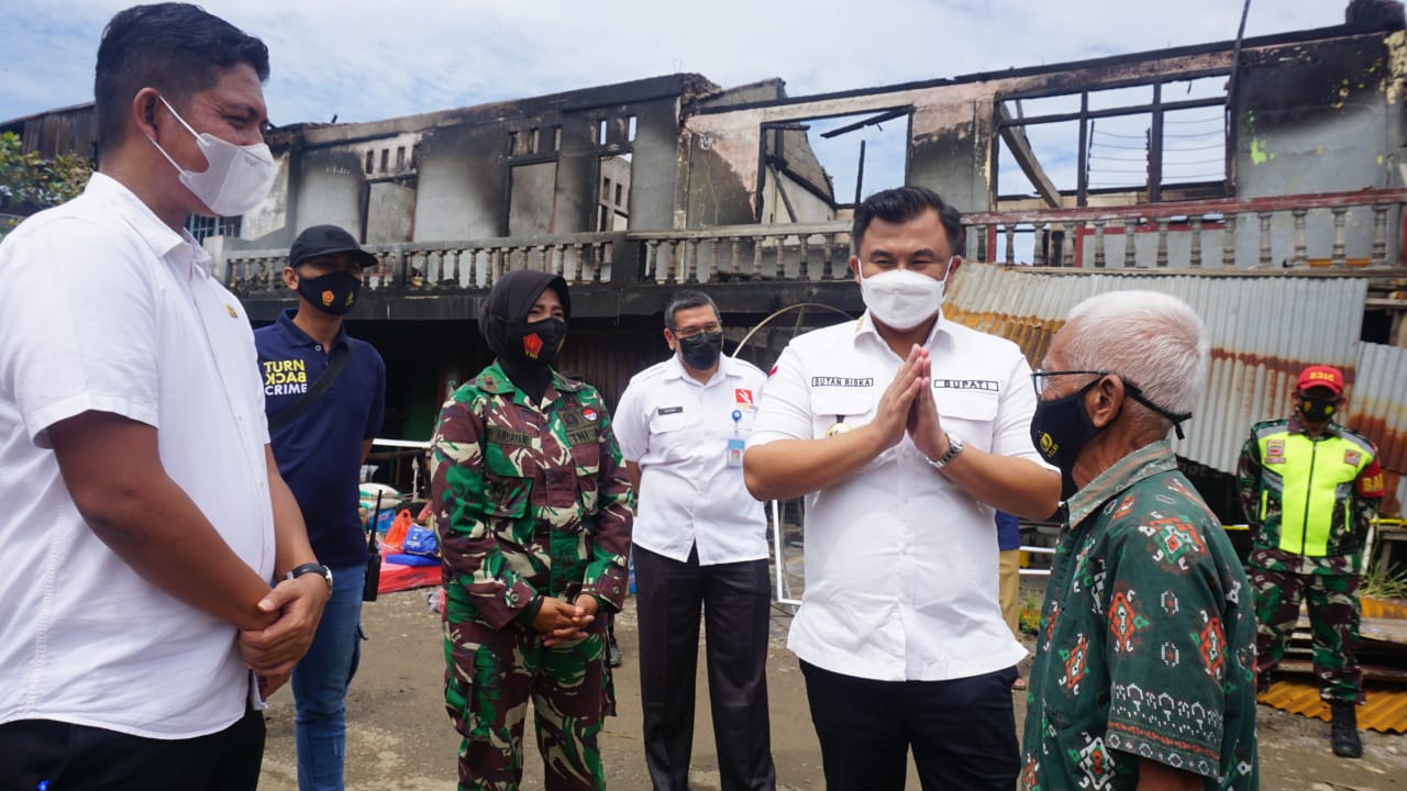 DHARMASRAYA – Enam ruko (rumah toko) di Pasar Tradisional Koto Agung Blok B Sitiung 1, Nagari Sungai Duo, Kecamatan Sitiung, hangus terbakar, Selasa (29/6/2021) malam. Merespon terjadinya musibah tersebut, Bupati Dharmasraya, Sutan Riska Tuanku Kerajaan, langsung meninjau ke lokasi kejadian, Rabu (30/6/21).