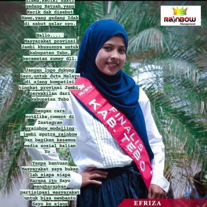 Efriza mengatakan, bahwa dirinya berharap penuh kepada Masyarakat Kabupaten Tebo Khususnya Kecamatan Sumay untuk memberikan dukungan dengan cara like sebanyak-banyak nya di instagram dengan cara follow akun @putra rainbow kemudian like Duta finalis Melayu atas nama Efriza guna mencatutkan diri sebagai pemenang.