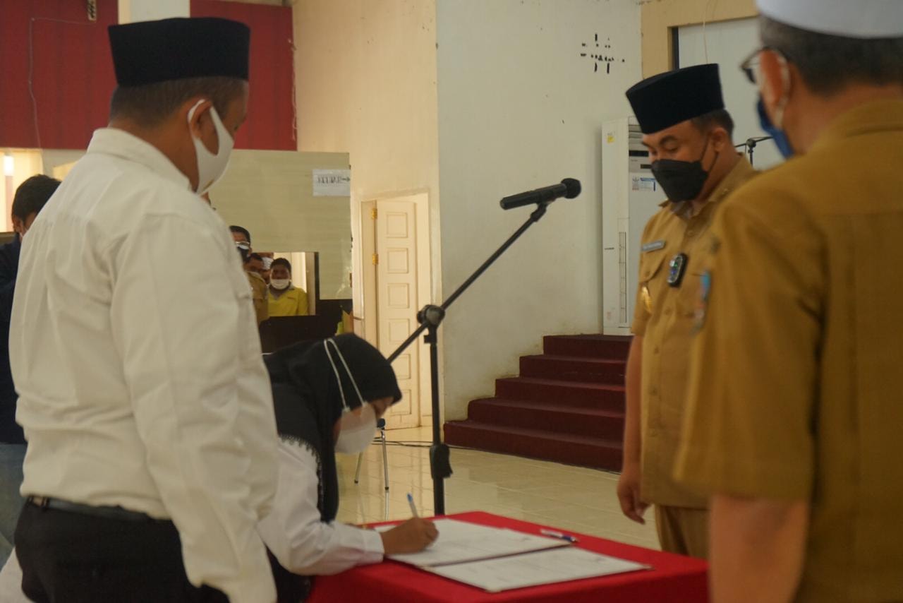 Dharmasraya – Sebanyak 109 Pegawai Pemerintah dengan Perjanjian Kerja (P3K) Kabupaten Dharmasraya, 82 guru dan 27 Penyuluh Pertanian, Senin (26/7), dilantik dan diambil sumpah janji sebagai pejabat fungsional di lingkungan Pemerintah Kabupaten Dharmasraya tahun 2021.