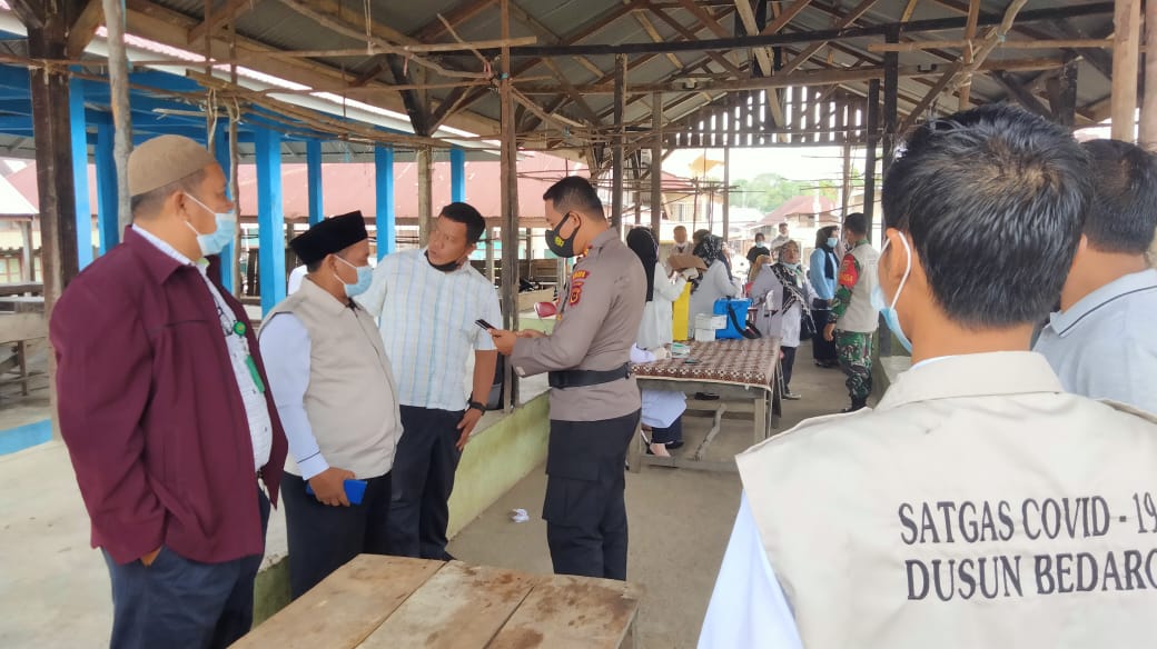 NARASIJURNAL.COM, BUNGO- Program Vaksinasi massal gratis, kali ini di Dusun Bedaro berjalan lancar di dua titik, Yakni pelaksanan di Los Pasar Bedaro dan di Ponpes Babussalam, giat Vaksinasi itu dipantau oleh Kapolsek Muko-Muko Bathin VII, Iptu Moh.Hasyim Asy’ari S.H.M.H, tampak hadir Camat, Pihak Danramil, Kepala Puskesmas dan Satgas Covid-19 Dusun Bedaro. Rabu, (8/09/2021).