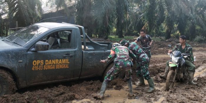 Pasiter Kodim 0416/Bungo Tebo, Kapten Inf Adrial Nursal menyebutkan, kondisi jalan memang berlumpur setelah hujan di lokasi TMMD. Kendati demikian tetap optimis dan semangat satgas mengantar pasokan BMM untuk alat berat berkerja.