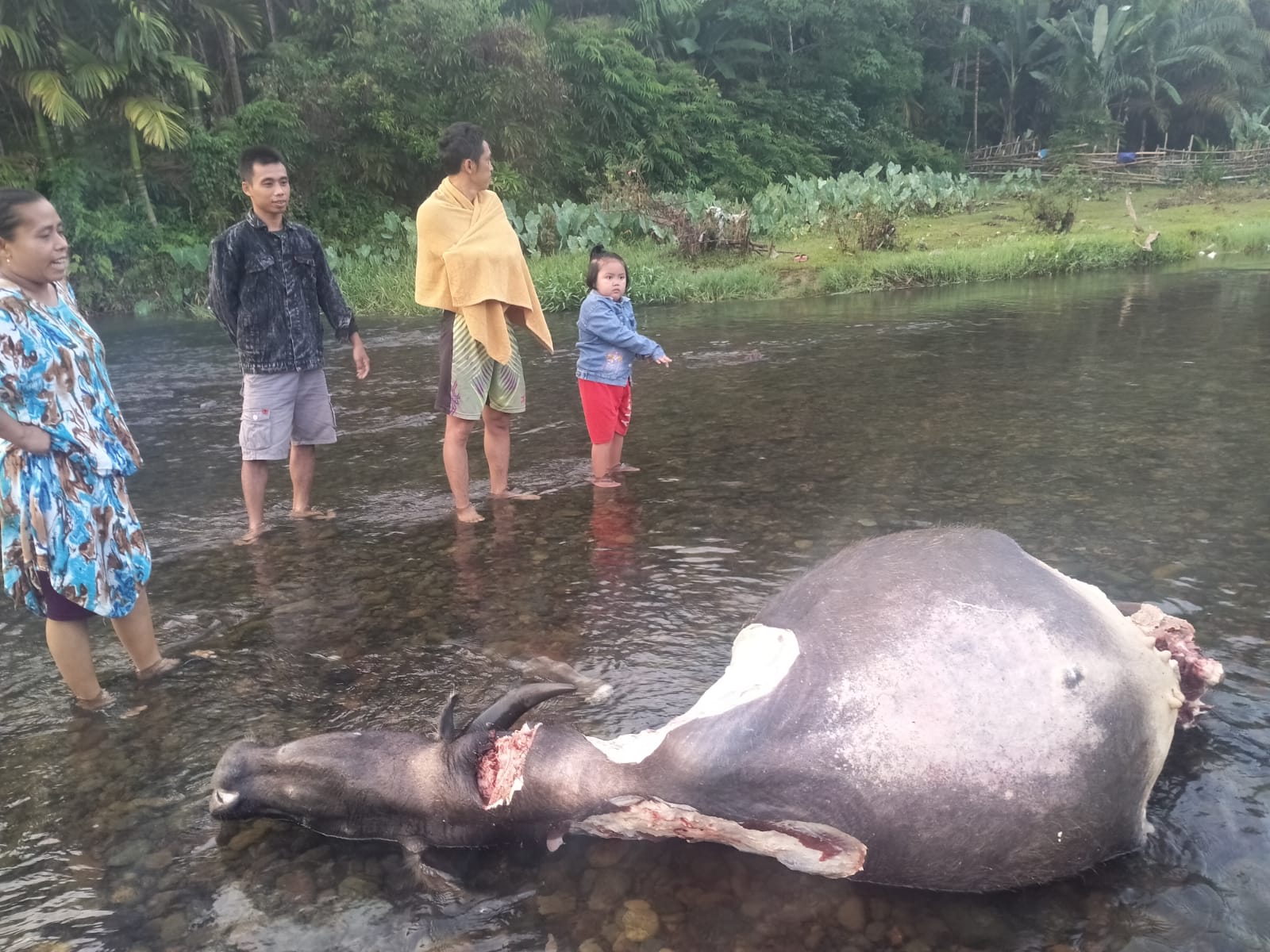 NARASIJURNAL.COM, BUNGO- Warga Dusun Lubuk Kayu Aro Kecamatan Rantau Pandan dihebohkan penemuan bangkai seekor kerbau tanpa kaki dan bagian leher sudah digorok. Bangkai ini ditemukan oleh warga  yang sudah tergeletak di Sungai, Pagi Minggu (12/9).