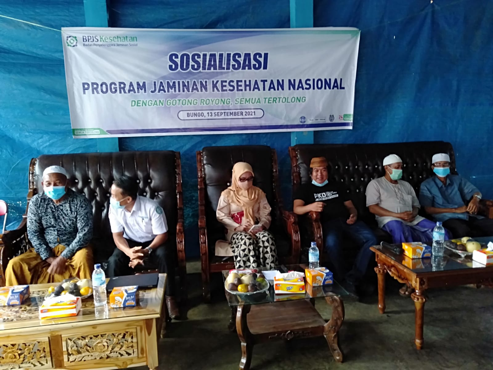 NARASIJURNAL.COM, BUNGO- Masyarakat Dusun Bedaro Kecamatan Muko Muko Bathin VII, ikuti sosialisasi program Jaminan Kesehatan Nasional (JKN) dengan tema dengan gotong royong, semua tertolong, kegiatan ini berlangsung di Los Pasar Bedaro, Senin (13/9).