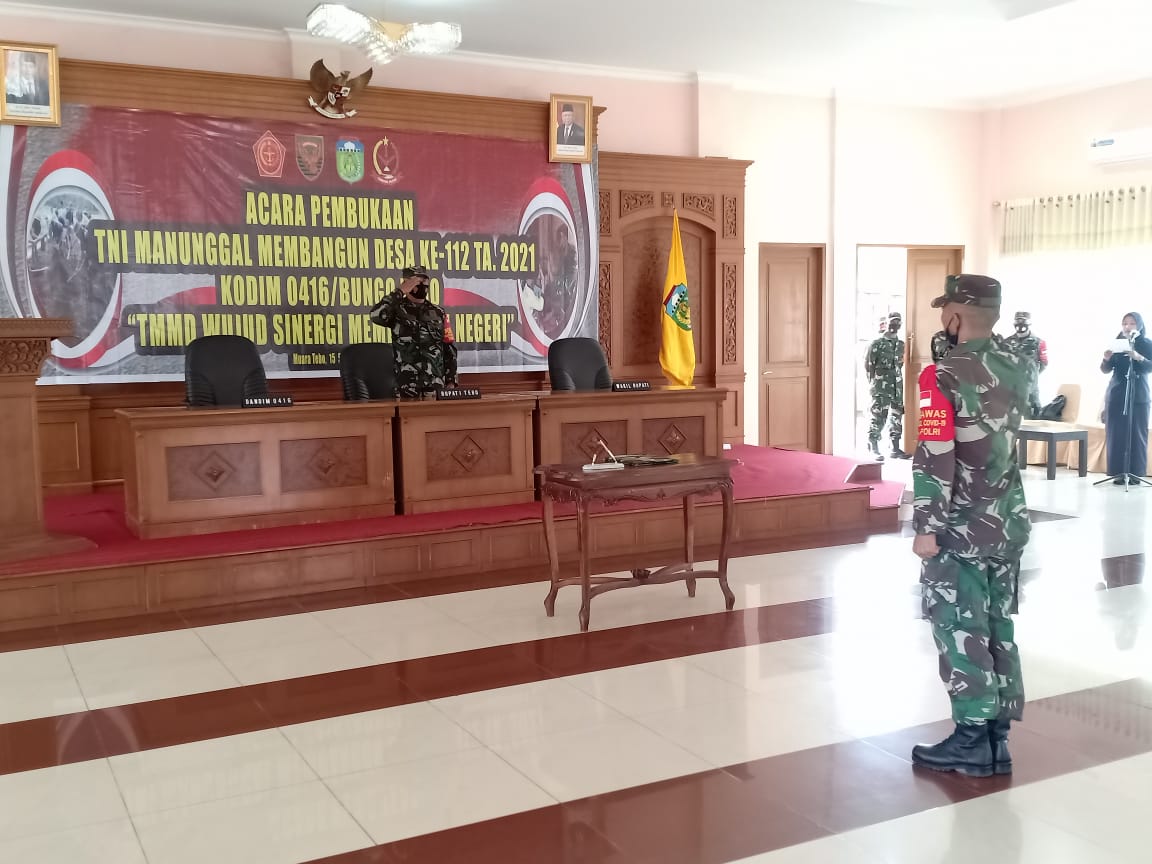 NARASIJURNAL.COM, TEBO – Dandim 0416/Bute Letkol Inf Arianto Maskare Subagio di dampingi Pabung serta Danramil 416-05/Muara Tebo. Pantau giat gladi bersih upacara pembukaan TMMD ke-112 di pendopo rumah dinas Bupati Tebo, Selasa (14/09/2021).