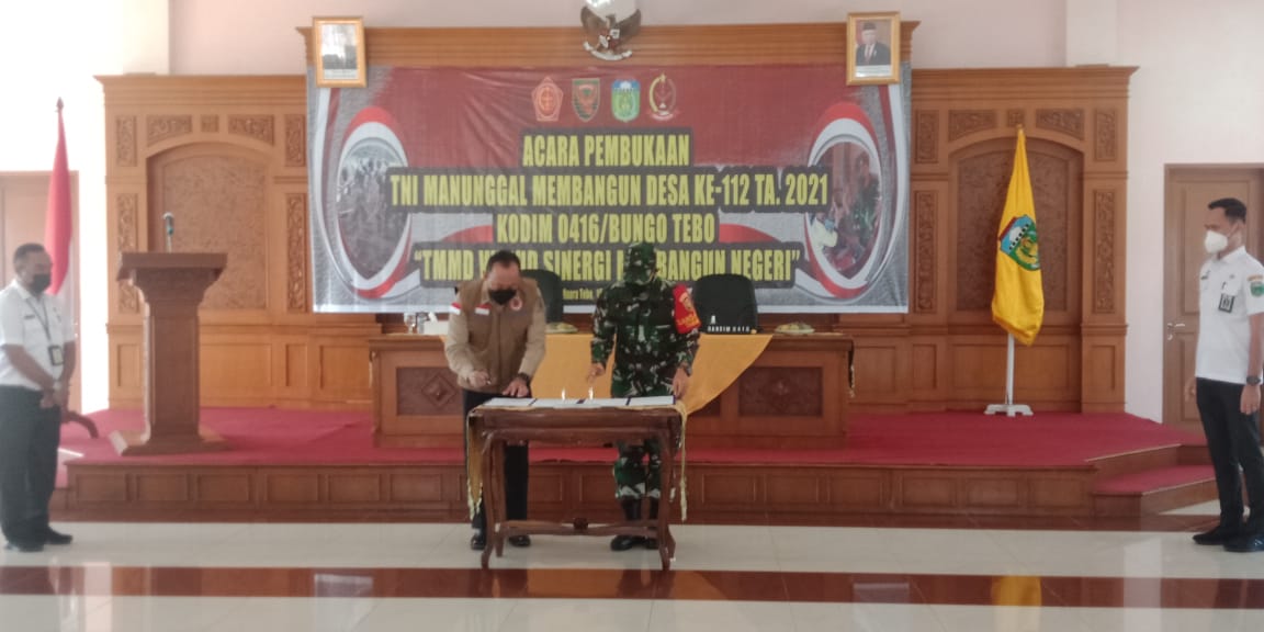 NARASIJURNAL.COM, BUNGO- Upacara Pembukaan kegiatan TNI Menuggal Membangun Desa (TMMD) ke 112 tahun 2021, Kodim 0416/ Bute di Kabupaten Tebo berlangsung khidmat dengan tetap menerapkan protokol kesehatan covid-19.