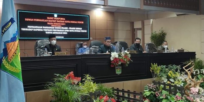 NARASIJURNAL.COM, SUNGAI PENUH – Dewan Perwakilan Rakyat Daerah (DPRD) Kota Sungai Penuh gelar rapat paripurna dengan agenda pandangan umum Fraksi Dewan terhadap penyampaian pidato pengantar Walikota Sungai Penuh terkait ranperda APBD perubahan tahun 2021,Senin (21/09).