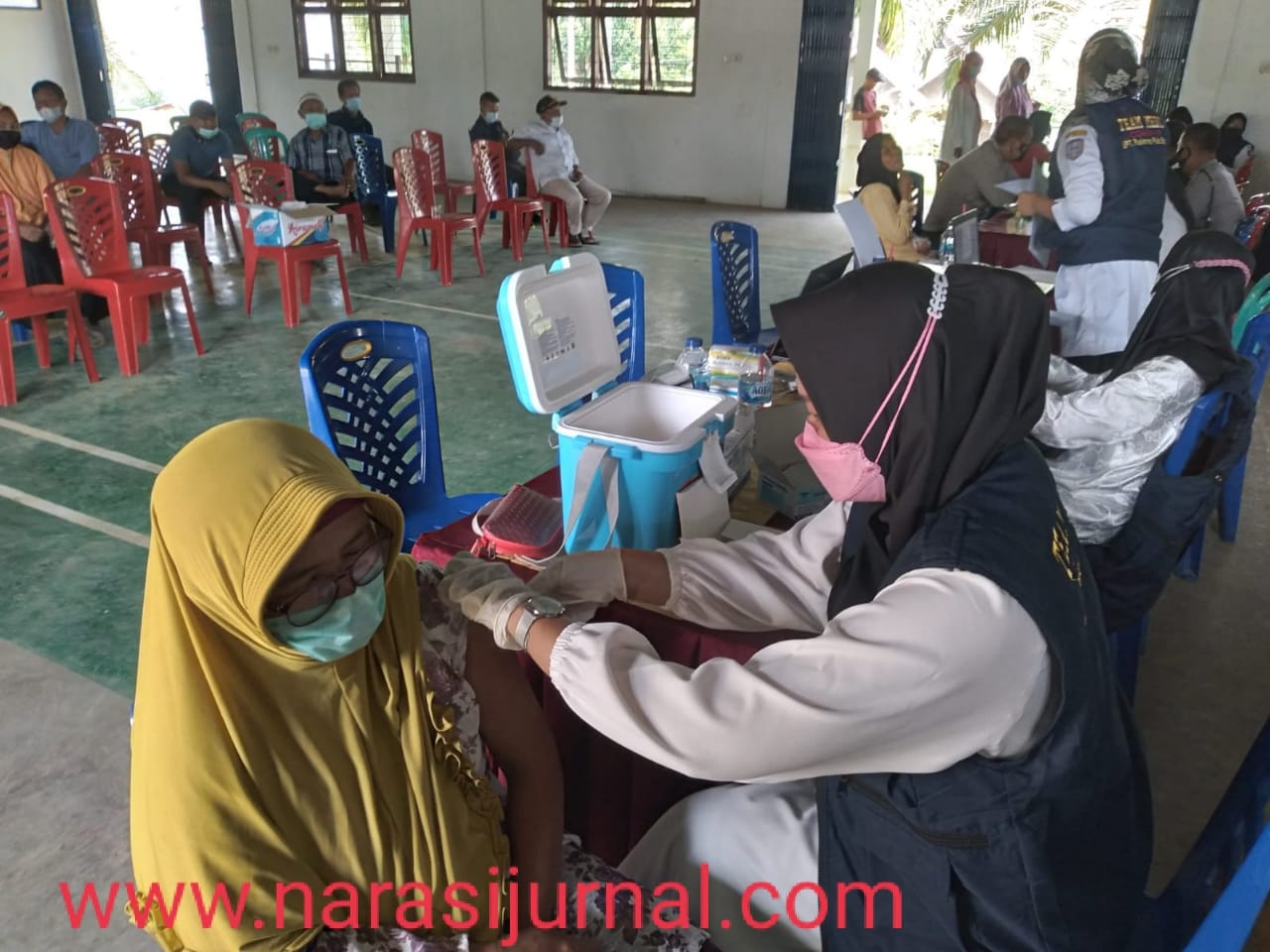 NARASIJURNAL.COM, BUNGO- Vaksinasi massal, diikuti puluhan warga dusun Bukit Sari Kecamatan Jujuhan mendapatkan vaksin covid-19 dosis pertama dan kedua. Kegiatan ini dilaksankan di gedung serba guna Bukit Sari, Rabu (22/9).