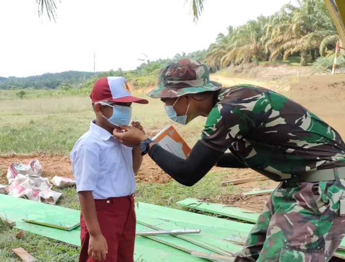 NARASIJURNAL.COM, Tebo – Bukan hanya fokus di insfratruktur pengerjaan fisik dalam kegiatan Satgas TMMD ke-112 Kodim 0416/Bute. Sosialisasi pencegahan covid-19 juga terus dilakukan, kali ini Satgas sambangi murid Sekolah Dasar (SD)  Pembantu RT Simpang Semangko, Kelurahan Sungai Bengkal, Kecamatan Tebo Ilir.