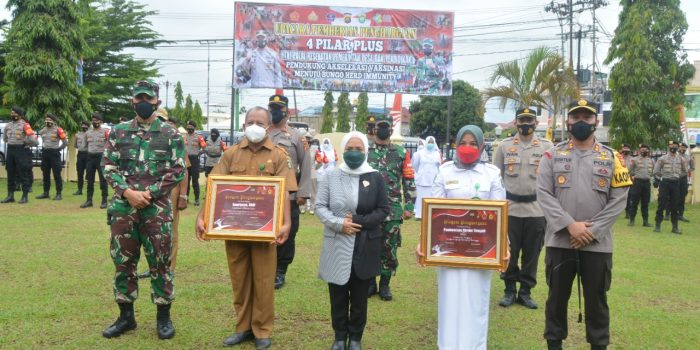 NARASIJURNAL.COM, BUNGO- Atas dedikasi dan kinerja yang baik, dalam perjuangan kemanusiaan pandemi covid-19, percepatan Imunitas tubuh kepada masyarakat. Dalam hal ini Kapolres Bungo AKBP Guntur Saputro S.IK.M.H memberikan penghargaan kepada 4 pilar TNI, Polri, kesehatan, pemerintah desa dan pendidikan. Digelar di halaman Mapolres Bungo, Sabtu (25/09/2021).