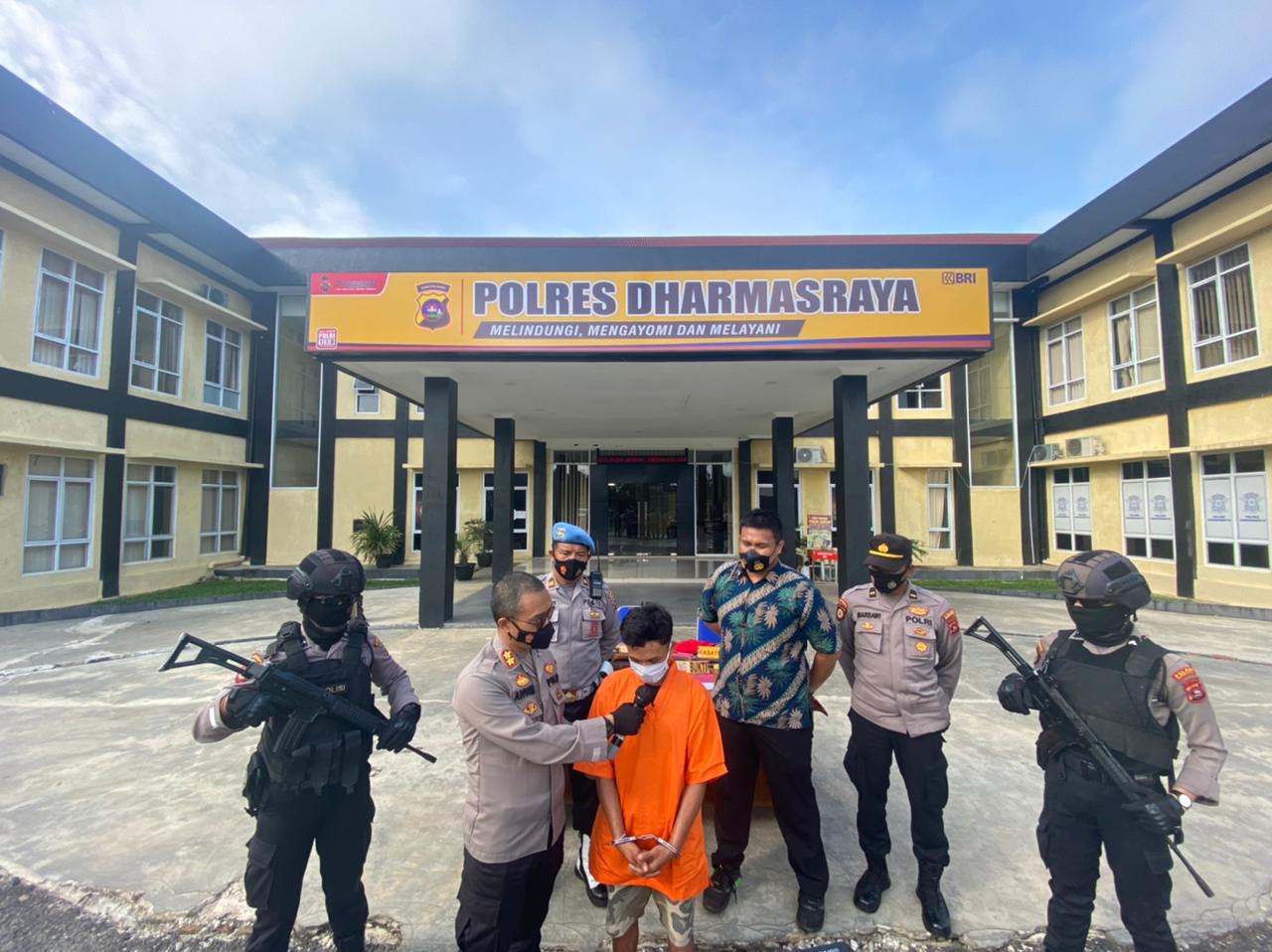 Dalam penyampaiannya Kapolres Dharmasraya AKBP Anggun Cahyono di hadapan awak media, mengatakan benar sekali anggota kami Tim Gabungan unit Polsek Sungai Rumbai dan Anggota Unit Reskim Polres Dharmasraya, telah mengamankan seorang laki laki berinsial PG umur 25 tahun.