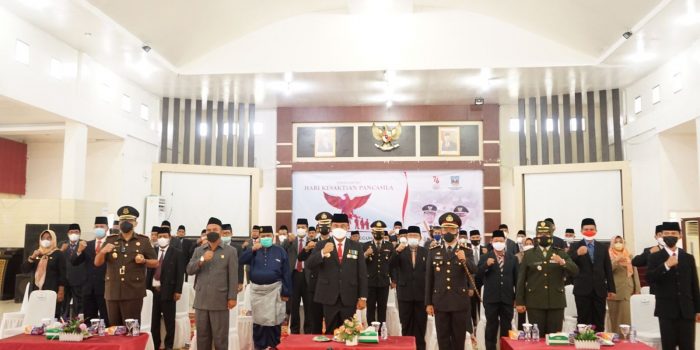 NARASIJURNAL.COM, DHARMASRAYA – Bupati Dharmasraya, Sutan Riska Tuanku Kerajaan, bersama Forkopimda, Staf Ahli Bupati, Asisten Setda dan para Kepala Perangkat Daerah mengikuti upacara peringatan Hari Kesaktian Pancasila tahun 2021 secara virtual, di Auditorium Kantor Bupati Dharmasraya, Jum’at (1/10/21).