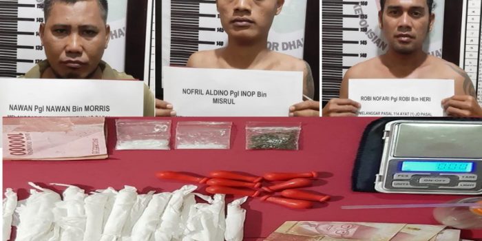 Kapolres Dharmasraya AKBP Anggun Cahyono,melalui Kasat Resnarkoba Polres Dharmasraya Iptu Rajulan Harahap didampingi KBO Satreskim Polres Dharmasraya Ipda Muhammad Isa, menyebutkan, Satresnarkoba Polres Dharmasraya telah mengamankan 3 diduga pelaku memiliki dan pengguna serta mengedar narkotika jenis sabu dan daun ganja.