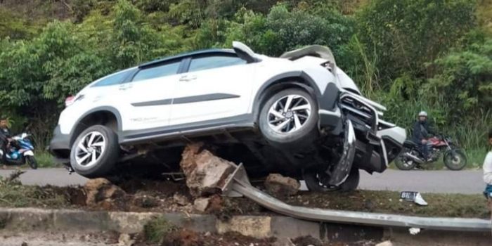 NARASIJURNAL.COM, Bungo- Satu unit mobil Toyota Rush nopol BH 1203 FP menabrak tiang lampu jalan, tepatnya di Jalan Lintas Sumatera (Jalinsum) Pal 6 dusun Sungai Mengkuang, kejadian sekira pukul 17.00 Wib, Rabu (6/10/2021).