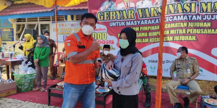 “Ya kami ikut peduli dengan kegiatan gebyar vaksinasi covid-19 secara massal ikut bersama perusahaan lain nya membantu sesuai dengan ketentuan dari perusahaan dari pusat. Semoga bantuan ini bisa diterima oleh masyarakat yang telah mendapatkan vaksinasi covid-19 di kecamatan jujuhan,”ungkap faskal.