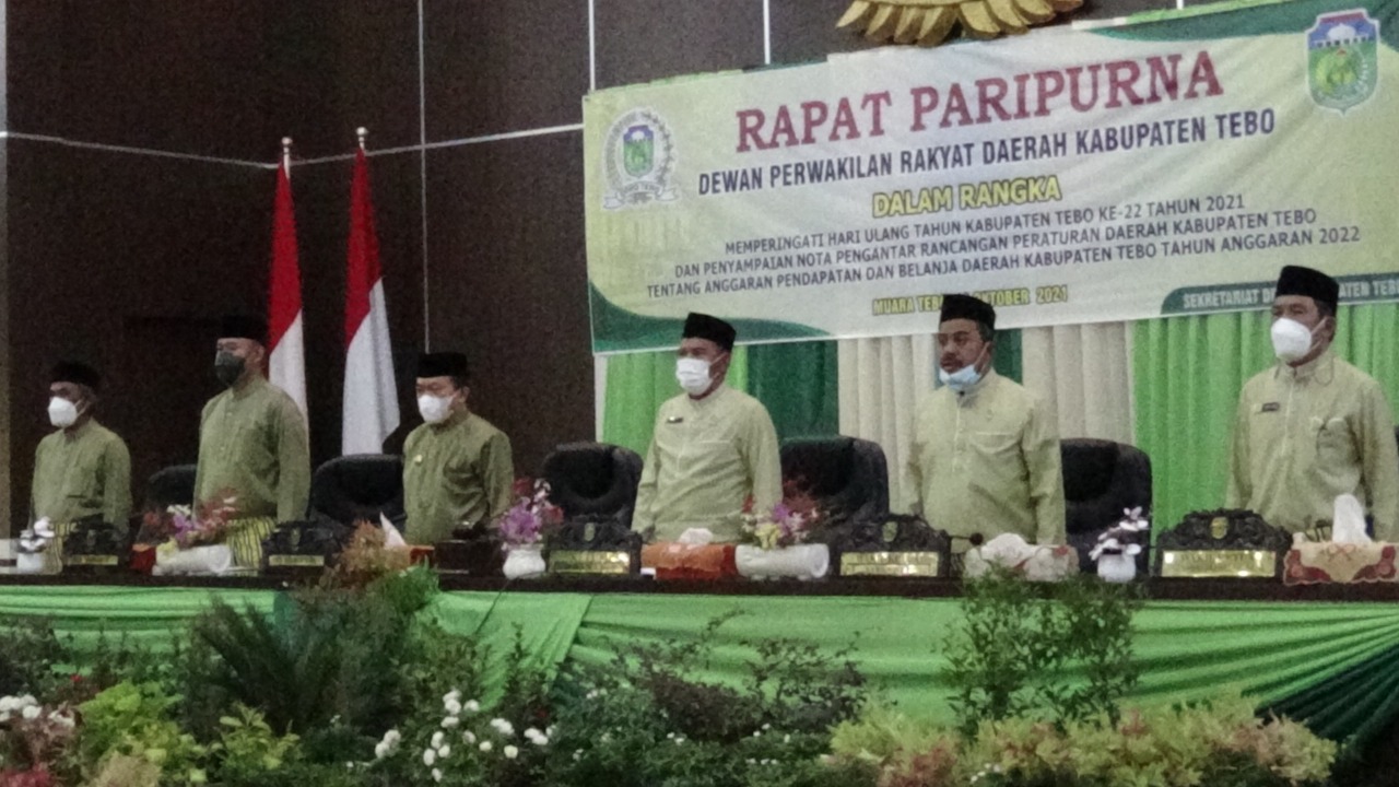NARASIJURNAL.COM, Tebo – Dewan Perwakilan Rakyat Daerah (DPRD) Kabupaten Tebo menggelar rapat paripurna dalam rangka memperingati Hari Ulang Tahun (HUT) Kabupaten Tebo yang ke-22 dan penyampaian nota pengantar rancangan peraturan daerah Kabupaten Tebo tentang anggaran pendapatan dan belanja daerah tahun anggaran 2022. Tetap patuhi protokol kesehatan, acara berlangsung hikmad di gedung ruang rapat DPRD Tebo, Senin (18/10/21).