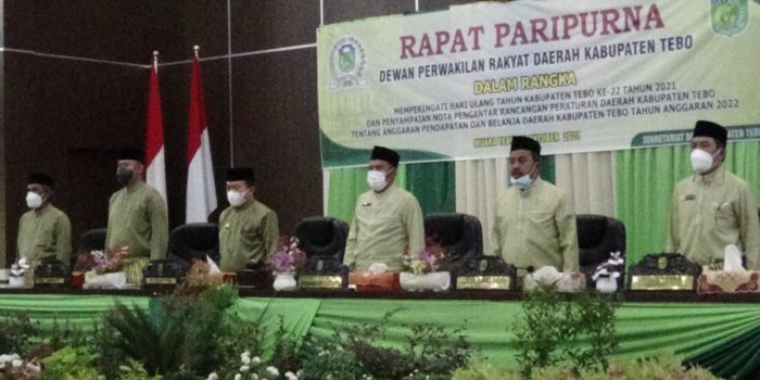 NARASIJURNAL.COM, Tebo – Dewan Perwakilan Rakyat Daerah (DPRD) Kabupaten Tebo menggelar rapat paripurna dalam rangka memperingati Hari Ulang Tahun (HUT) Kabupaten Tebo yang ke-22 dan penyampaian nota pengantar rancangan peraturan daerah Kabupaten Tebo tentang anggaran pendapatan dan belanja daerah tahun anggaran 2022. Tetap patuhi protokol kesehatan, acara berlangsung hikmad di gedung ruang rapat DPRD Tebo, Senin (18/10/21).