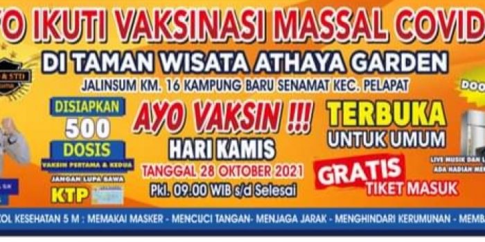 “Giat ini terbuka untuk umum, cukup bawa KTP. Ayo… yang belum divaksin silahkan datang besok ke Athaya Garden, kita juga sediakan hadiah elektronik dan bingkisan menarik, disediakan dosis vaksin ya lebih kurang 500 dosis,” ucap Brigpol Maidani saat dikonfirmasi melalui via Handpon pribadinya. Rabu, (27/10/2021).