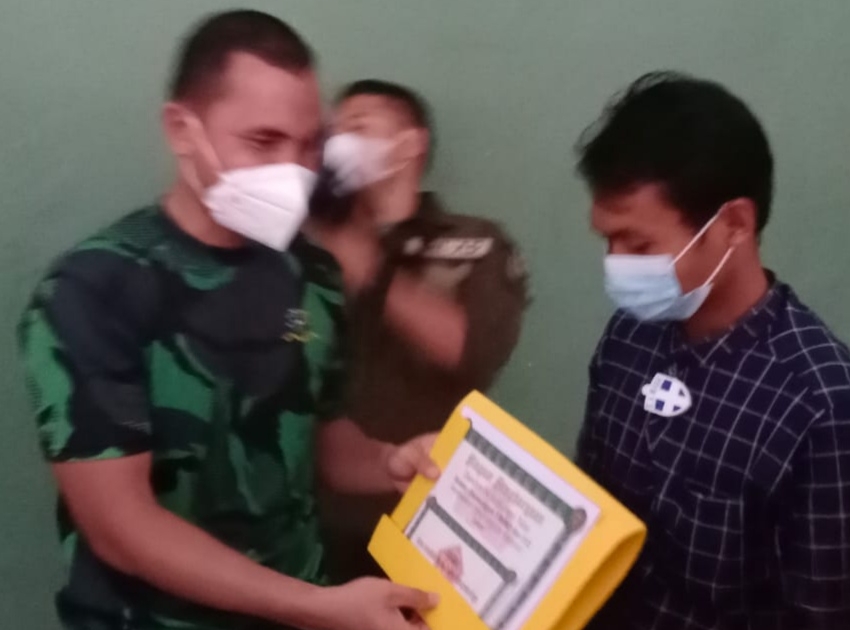 NARASIJURNAL.COM, BUNGO- Komandan Kodim 0416 Bungo Tebo Letkol. Inf. Arianto Maskare Subagio, S. Sos., M. Si memberikan piagam penghargaan kepada Musta’im Pimpinan media topikjambi.id Sabtu 30 Oktober 2021.