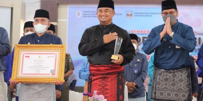 Penghargaan tersebut diserahkan secara virtual oleh Menteri PANRB, Tjahjo Kumolo, kepada Bupati Dharmasraya, Sutan Riska Tuanku Kerajaan, di Auditorium Kantor Bupati Dharmasraya, Selasa (9/11/21). Turut mendampingi bupati pada penerimaan penghargaan tersebut Sekretaris Daerah, Adlisman, Kepala Dinas Sosial P3APPKB, Bobby Perdana Riza, Kepala Bagian Organisasi, Budi Waluyo dan sejumlah pejabat lainnya.