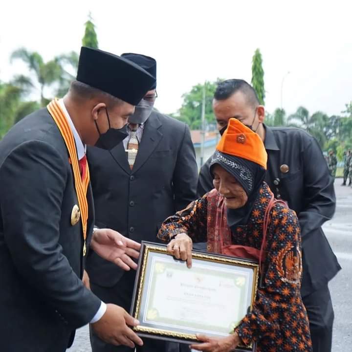 NARASIJURNAL.COM, Dharmasraya –  Di momentum peringatan hari pahlawan, pemerintah kabupaten Dharmasraya memberikan penghargaan kepada Veteran yang pernah bertugas di Dharmasraya. Penghargaan diserahkan oleh Bupati Dharmasraya, Sutan Riska Tuanku Kerajaan, jelang upacara peringatan Hari Pahlawan di halaman Kantor Bupati Dharmasraya, Rabu (10/11/21).