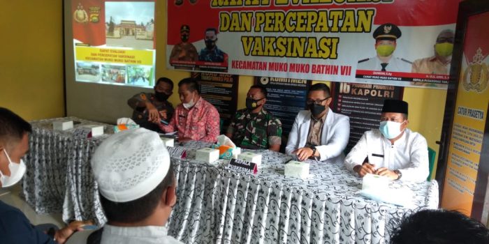 Kapolsek Muko-muko Bathin VII Moh.Hasyim Asy’ari S.H, M.H mengatakan, rapat evaluasi dan percepatan vaksinasi ini bertujuan untuk mengukur sejauh mana kinerja dalam pelaksanaan vaksinasi di wilayah kecamatan Muko Muko Bathin VII, serta langka apa yang harus diupayakan agar vaksinasi tercapai sesuai yang diharapkan.