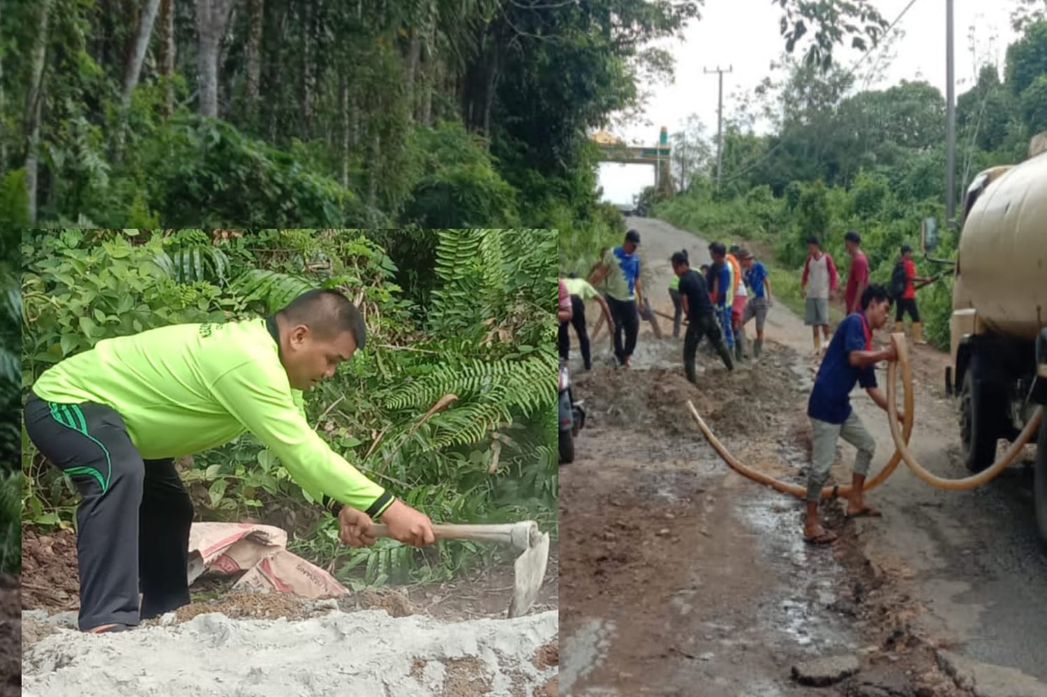 Bersama Warga, Brigpol Maidani Berjibaku Perbaiki Jalan Poros Dusun Bedaro