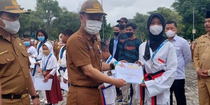 NARASIJURNAL.COM, SUNGAI PENUH – Walikota Sungai Penuh diwakili Pj. Sekretaris Daerah Alpian menyerahkan mendali kepada atlet Taekwondo pemenang kejuaraan Kemenpora Sumsel Open 2022 bertempat di Lapangan Upacara Kantor Walikota, Senin (24/1)