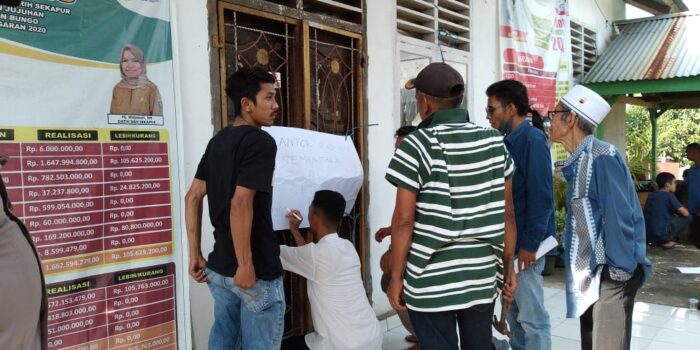 NARASIJURNAL.COM, Bungo – Kamis (24/03/2022), sekira pukul 14.00 Wib, ratusan warga dusun Sirih Sekapur kecamatan Jujuhan, kabupaten Bungo padati halaman kantor rio dusun sirih sekapur, bahkan warga merasa kesal sehingga menyegel kantor Rio. Penyegelan terkait adanya dugaan penggelapan dana Pendapatan Asli Daerah (PAD) dusun Sirih Sekapur.