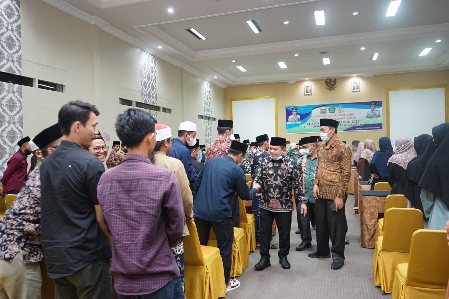 “Pada kesempatan ini saya selaku pribadi dan Pemerintah Provinsi Jambi mengucapkan Selamat Hari Raya Idul Fitri 1443 Hijriah, mohon maaf lahir dan batin, semoga amal ibadah dan puasa kita diterima oleh Allah Subhanahu Wa Tata’la. Pada saat ini, alhamdullilah kita bisa hadir dan bersilaturahmi bersama para Qori dan Qoriah terbaik se-Provinsi Jambi, yang nantinya menjadi perwakilan atau utusan Provinsi Jambi di Musabaqoh Tilawatil Quran (MTQ) ke-29 di Provinsi Kalimantan Selatan,” ujar Al Haris.