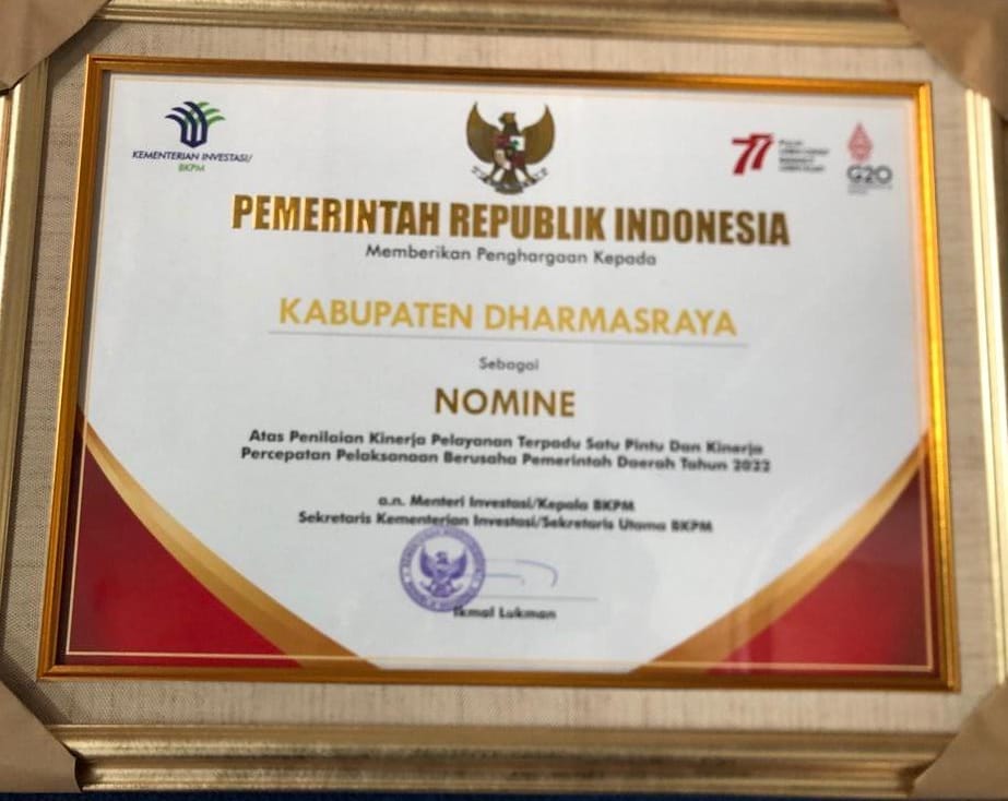 Pemerintah Kabupaten Dharmasraya melalui Dinas Penanaman Modal dan Pelayanan Terpadu Satu Pintu (DPMPTSP) menjadi salah satu nominasi delapan terbaik kategori pemerintah daerah bersama tujuh kabupaten di seluruh Indonesia. “Alhamdulhan kita masuk nominasi delapan besar nasioanl dari 416 kabupaten seluruh Indonesia. Meski belum masuk tiga besar, namun secara peringka kita kita naik dari sebelumnya berada di urutan 12,” Sebut Asisten Ekbang Yefrinaldi didampingi Kepala Dinas PMPTSP Dharmasraya Naldi S.STP, M.Si saat dihubungi di Dharmasraya, Rabu (12/10/2022).
